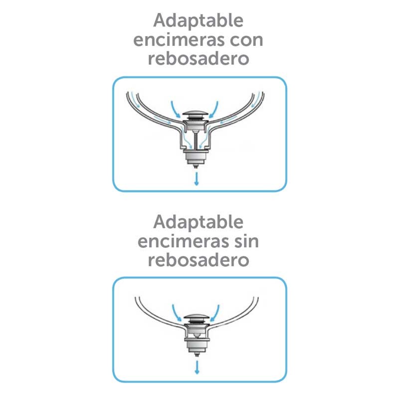 Válvula universal acabamento cromado modelo CLIC CLAC de 65 mm de diâmetro adaptável a bancadas de casa de banho com escoadouro como sem ele.
