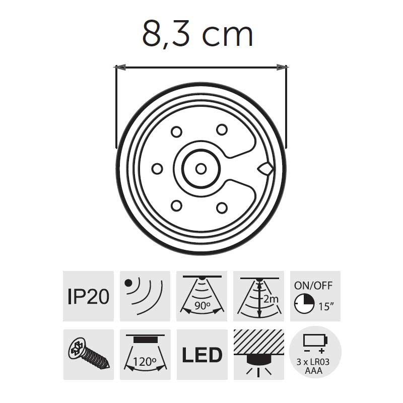 Expanda Aplique redondo de superfície modelo Ursa para móveis de casa de banho de 8,3 cm de diâmetro, iluminação led de 0,42 watts, 42 lúmens e luz natural.