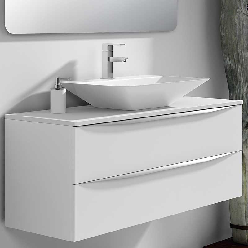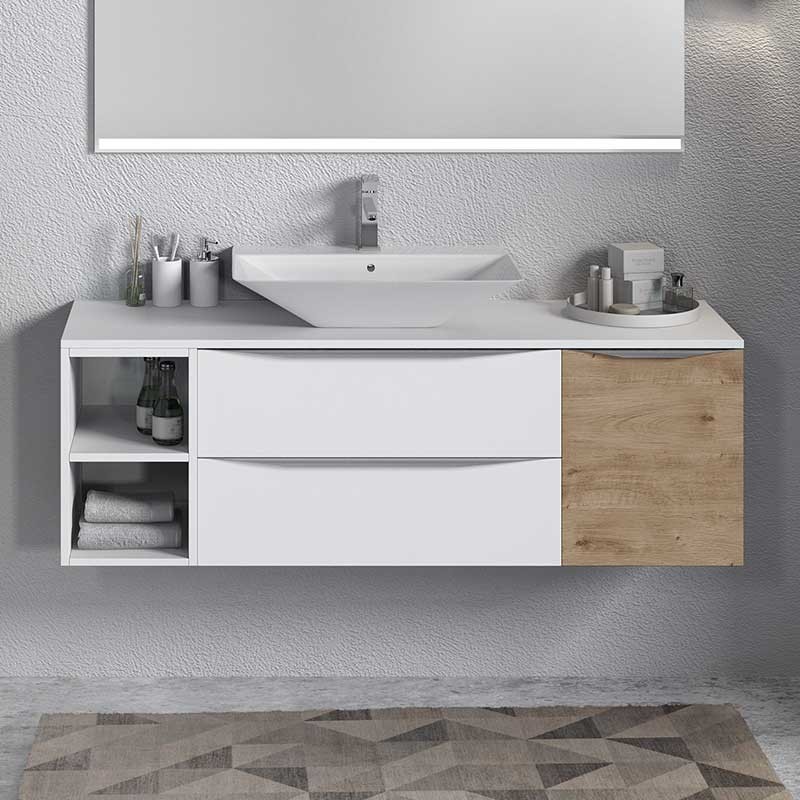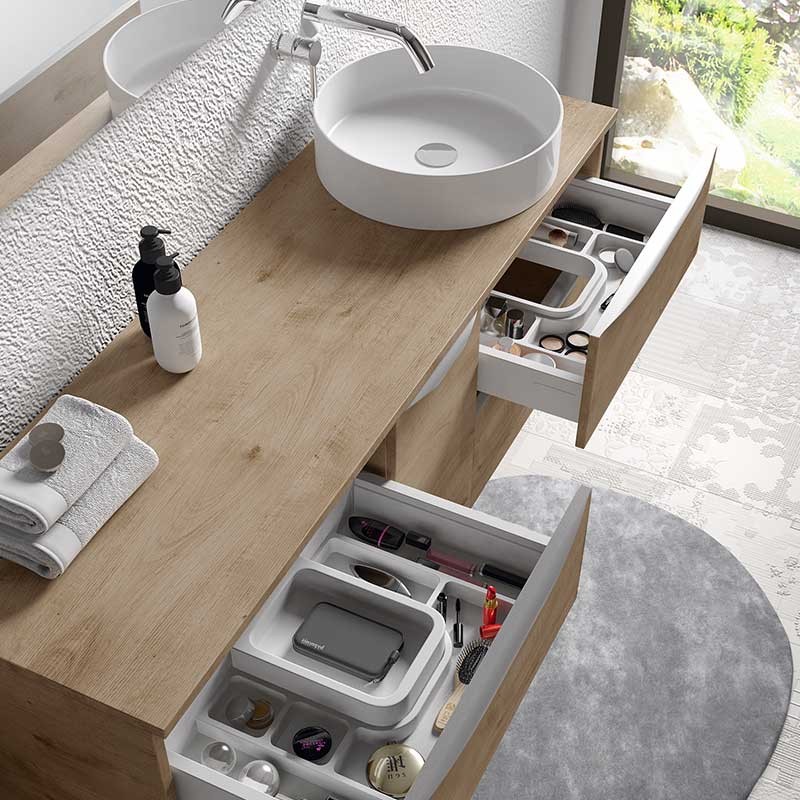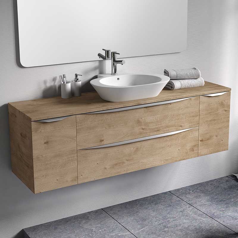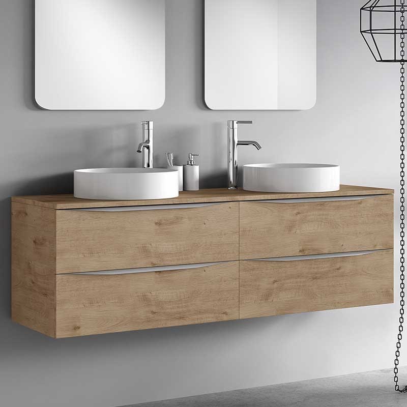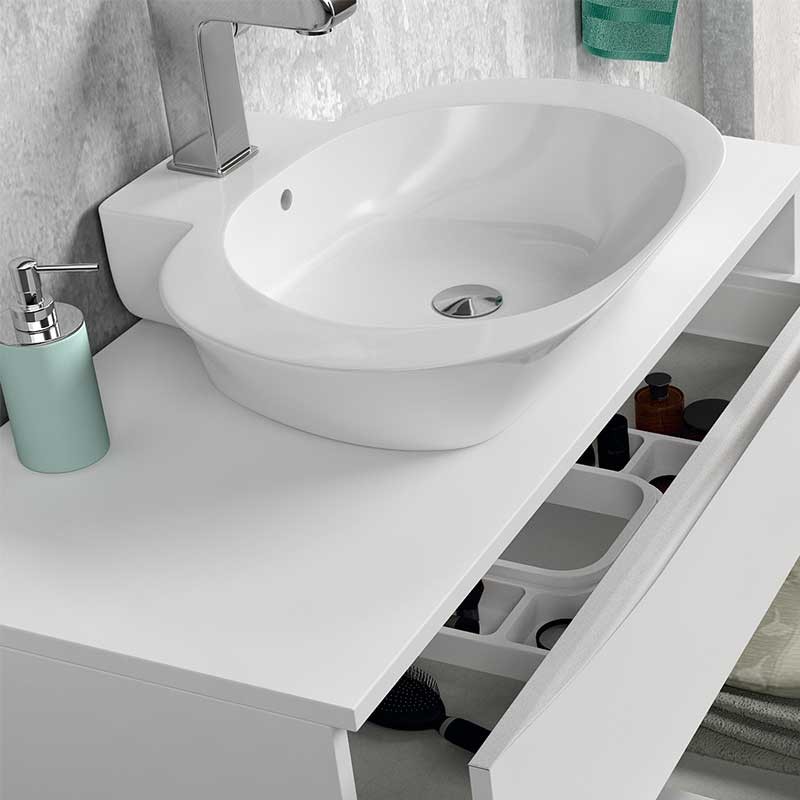 Expanda Tampa bancada modelo Landes para móveis de banheiro feito em MDF, resistente 19 mm de espessura revestida com laser. Acabamento branco fosco ou carvalho natural a escolher.