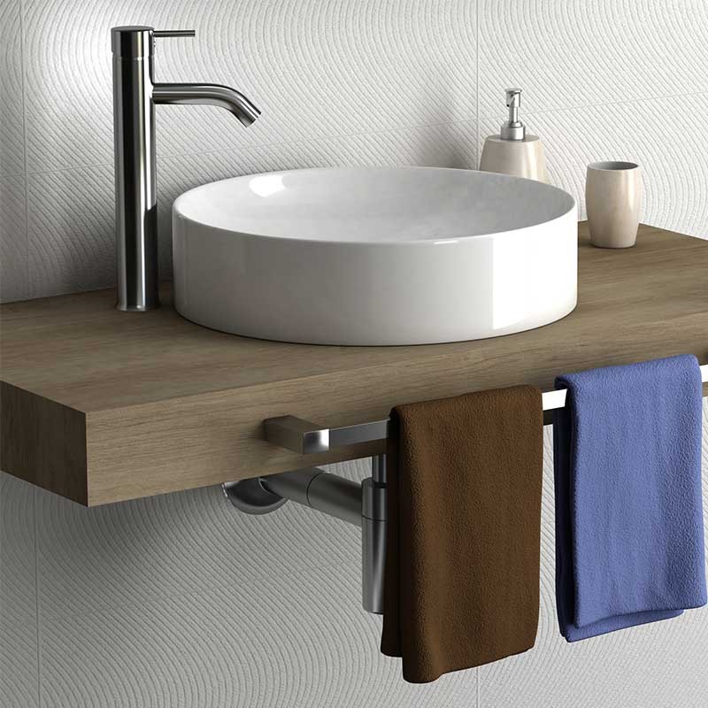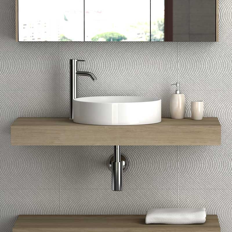 Expanda Bancada de banheiro modelo Flow fabricada em madeira de 8 cm de espessura e acabamento em carvalho natural com tratamento impermeabilizante. Disponível em várias medidas.