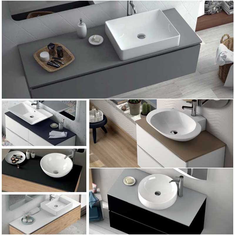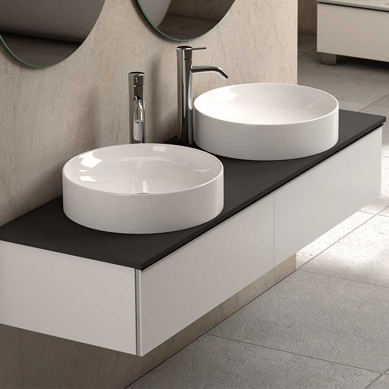 Expanda Tampa bancada modelo Masai para móveis de casa de banho fabricada com carga mineral de 2 cm de espessura revestida de poliuretano acrílico acabamento liso.