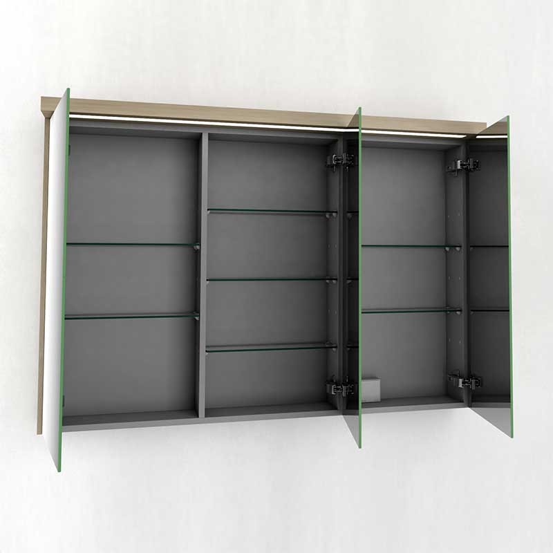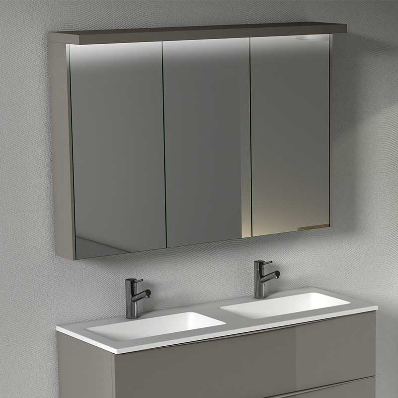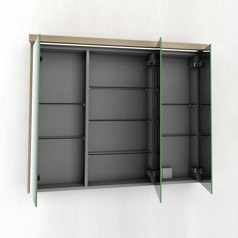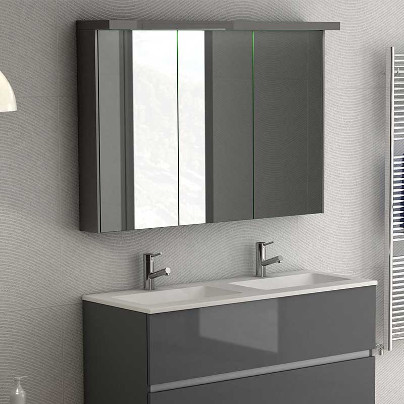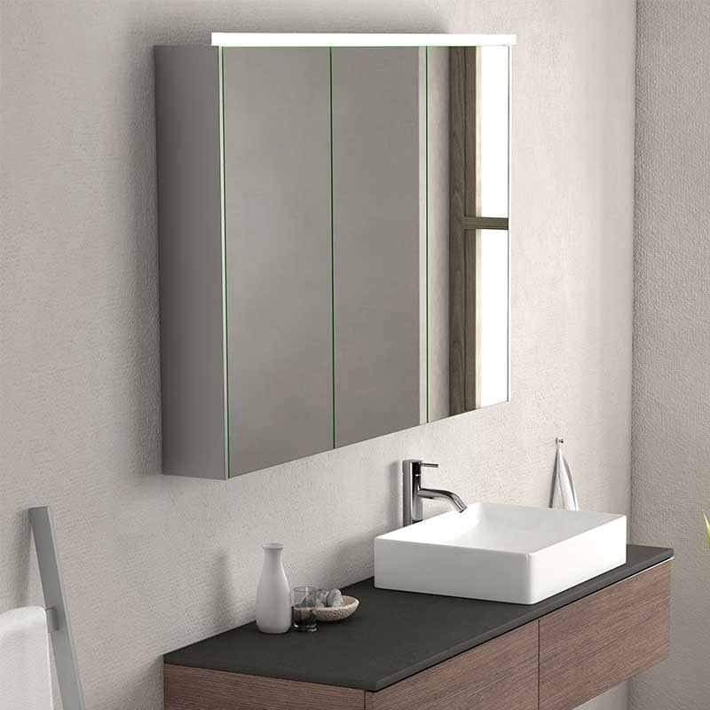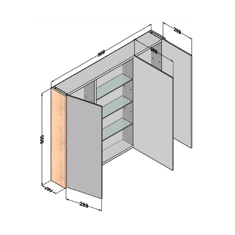 Expanda Armário camarim de uma casa de banho de 3 portas modelo Skyline com espelho de dupla face, dobradiças com sistema de fecho amortecido e 7 prateleiras de vidro no seu interior.
