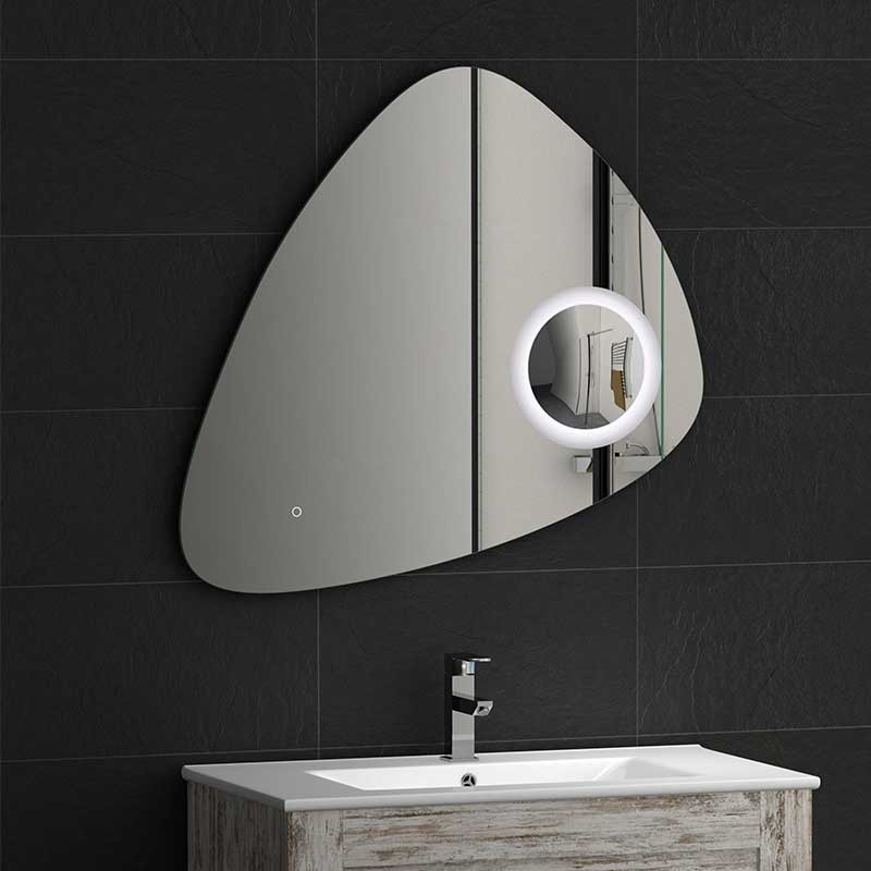 Expanda Espelho diodo emissor de luz para a casa de banho modelo Stone com vidro de 5 mm de espessura, área anti-embaciamento, sensor de acendimento de toque e lupa de 3x.