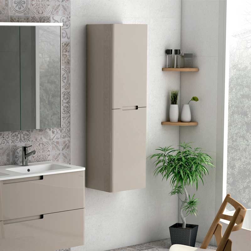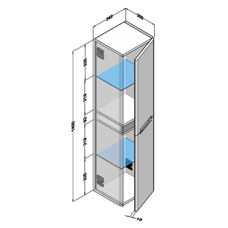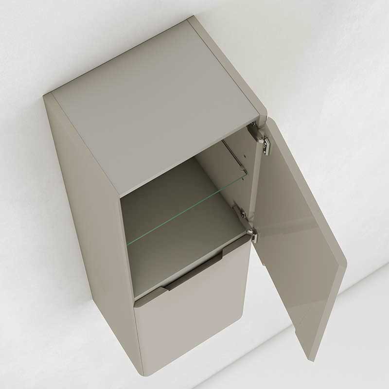 Expanda Rack coluna para pendurar-se na parede modelo Omega com 2 portas, dobradiças com sistema de fecho amortecido e 2 prateleiras de vidro no seu interior.