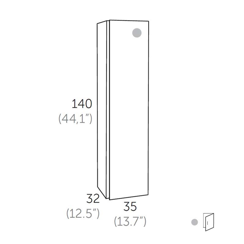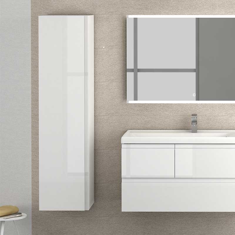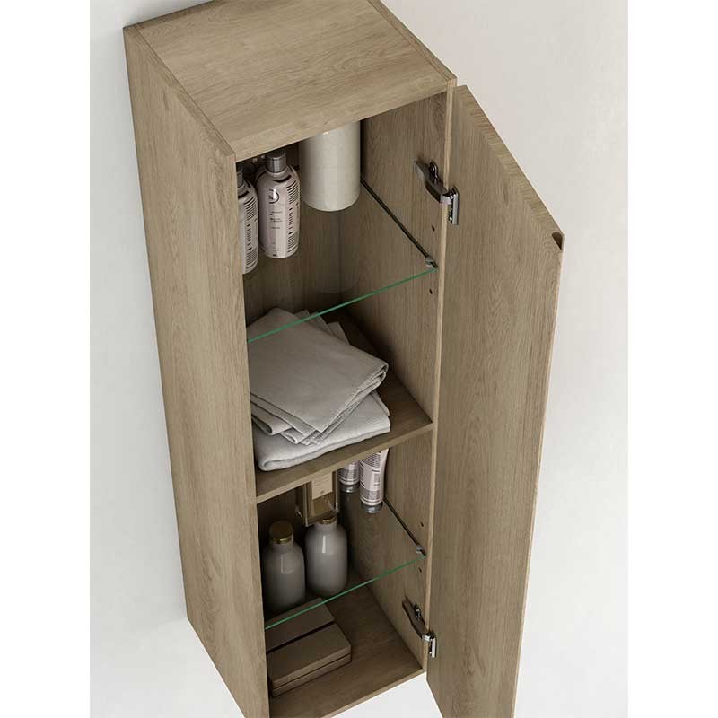 Expanda Rack coluna para pendurar-se na parede modelo Cairo com 1 porta com puxador integrado, dobradiças com sistema de fecho amortecido e 2 prateleiras de vidro no seu interior.