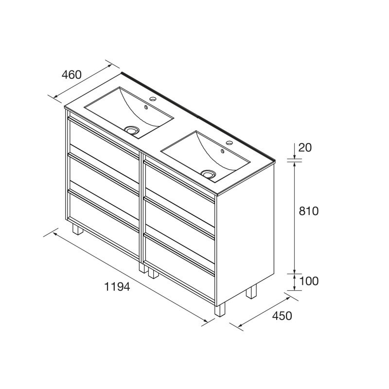O armário de banheiro suspenso está disponível em várias medidas (600, 800, 850, 1000 ou 1200 mm de largura e 45 mm de fundo), e conta com três gavetas que fornecem amplo espaço de armazenamento.