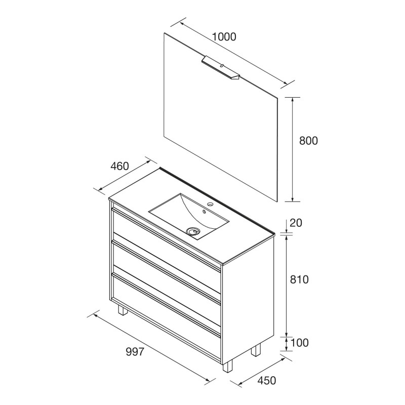 O armário de banheiro suspenso está disponível em várias medidas (600, 800, 850, 1000 ou 1200 mm de largura e 45 mm de fundo), e conta com três gavetas que fornecem amplo espaço de armazenamento.