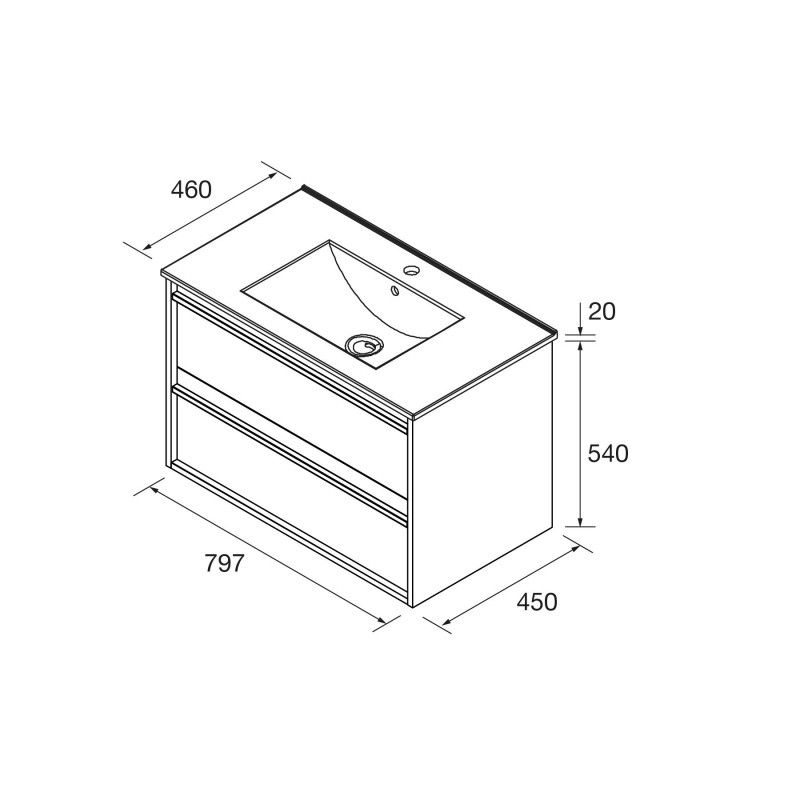 O armário de banheiro suspenso ATTILA, com 800 mm de largura e 45 mm de fundo, conta com duas gavetas eles fornecem amplo espaço de armazenamento.