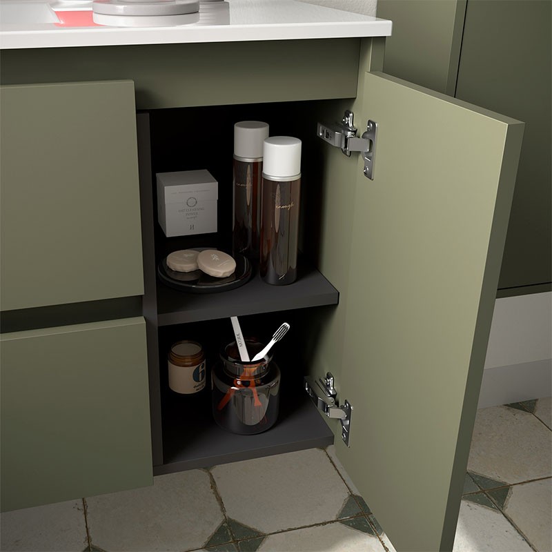 As duas portas oferecem acesso conveniente ao armazenamento, enquanto as gavetas com fecho amortecido e guias Hettich garantir uma operação suave e de alta qualidade.