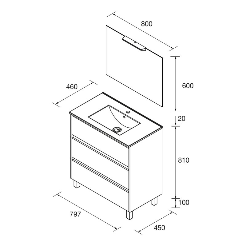 Composto de armário Noja de 3 gavetas, lavatório de porcelana, espelho e arandela LED. Incluído conjunto de 4 pernas anodizado brilho 100mm.