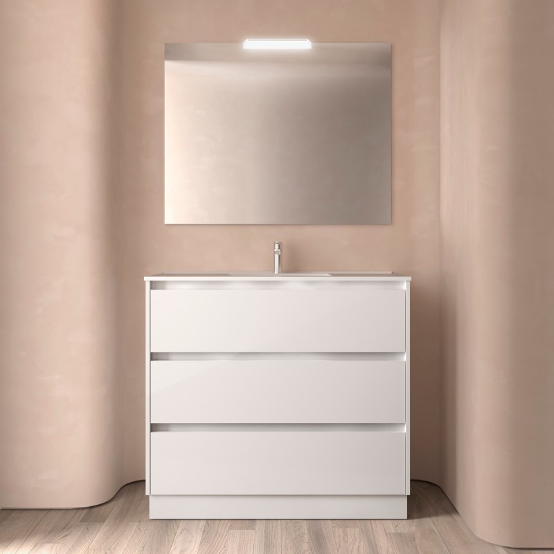 Composto de armário Noja de 3 gavetas, lavatório de porcelana, espelho e arandela LED. Incluído conjunto de 4 pernas