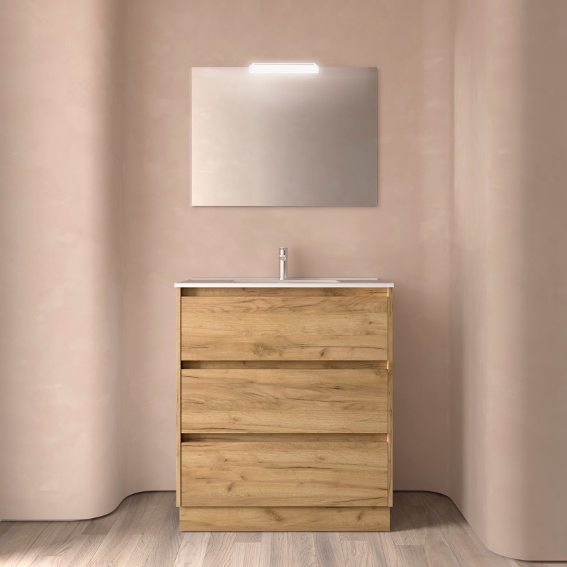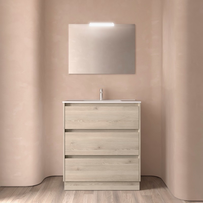 Composto de armário Noja com 3 gavetas e lavatório de porcelana. Incluído jogo de 4 pernas anodizado brilho de 100mm.