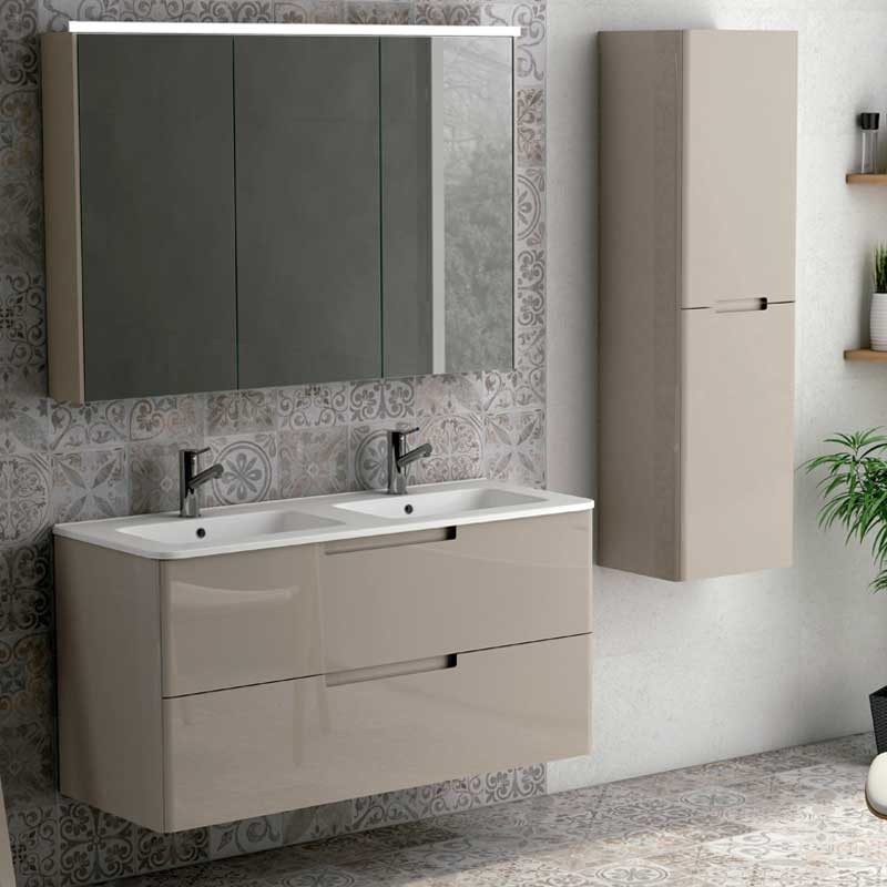 Expanda Armário suspenso para banho modelo Omega com 2 gavetas grandes, mas lavatório bancada de cerâmica de 1 ou 2 seios. Espelho camarim com aplique Skyline opcional.