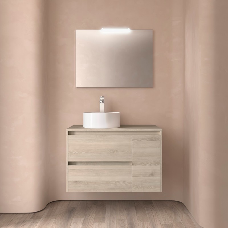 O conjunto de móveis de banheiro Noja 85 de 2 gavetas armário, bancada e 1 porta direita combina design simples e funcionalidade, adaptando-se perfeitamente a qualquer estilo de banheiro. Com esta série, poderá descobrir e criar a casa de banho dos seus sonhos, graças às diversas opções que oferece em três medidas diferentes.