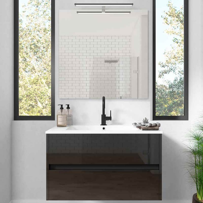 Armário suspenso de 2 gavetas em diferentes tamanhos e acabamentos. Espelho, arandela led e móvel auxiliar para pendurar opcional.